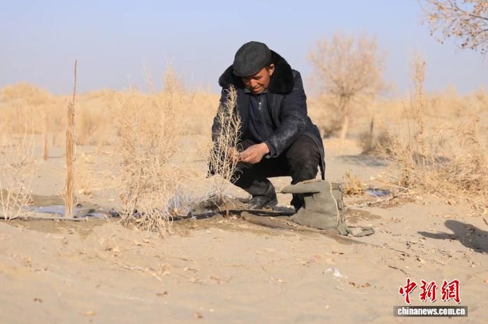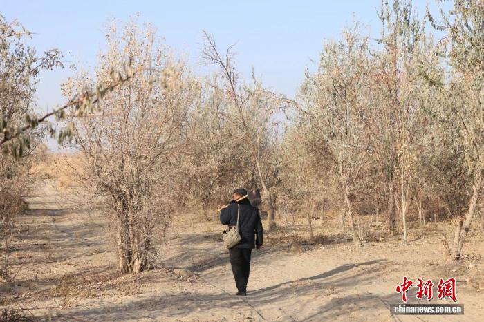 中新网新疆麦盖提11月27日电 (任鹏程 陈文军 艾斯凯尔·赛麦提)冬日的塔克拉玛干沙漠透着刺骨寒意。近来,在新疆麦盖提县沙海林场的林间小道上,护林员阿布都莫明·衣明一大早便开端了一天的巡护作业。